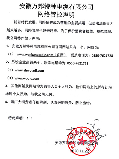 鄭重聲明:安徽萬邦特種電纜有限公司官方網站為:www_wanbangcable_com.hrbrf.cn,除此之外無任何子網站或合作網站,其余均為假冒偽劣。電話:0550-7621728 13485756353 地 址:安徽省天長市滁州高新技術產業開發區經四路29號
